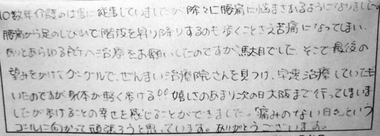 10数年介護のお仕事をされていて、だんだんと腰痛に悩まされていたとのこと。腰痛だけでなく足のしびれまで起こり、階段の上り下りだけでなく歩くことさえも苦痛になっていました。